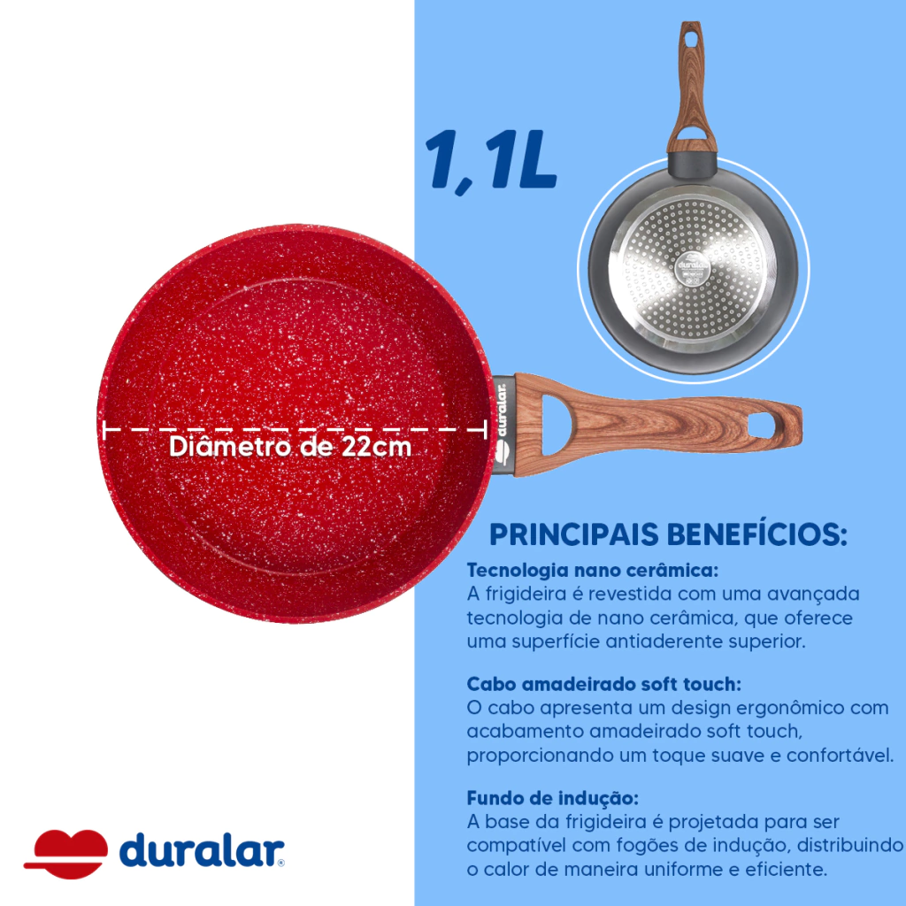Eleve sua experiência culinária com a Frigideira Duralar Red Marble de 22 cm. Com capacidade de 1,1 litros, esta frigideira é ideal para preparar uma variedade de pratos, desde refogados a grelhados. Feita de alumínio forjado, possui um avançado revestimento Nanocerâmico antiaderente, que permite cozinhar de maneira saudável e prática, reduzindo a necessidade de óleos.