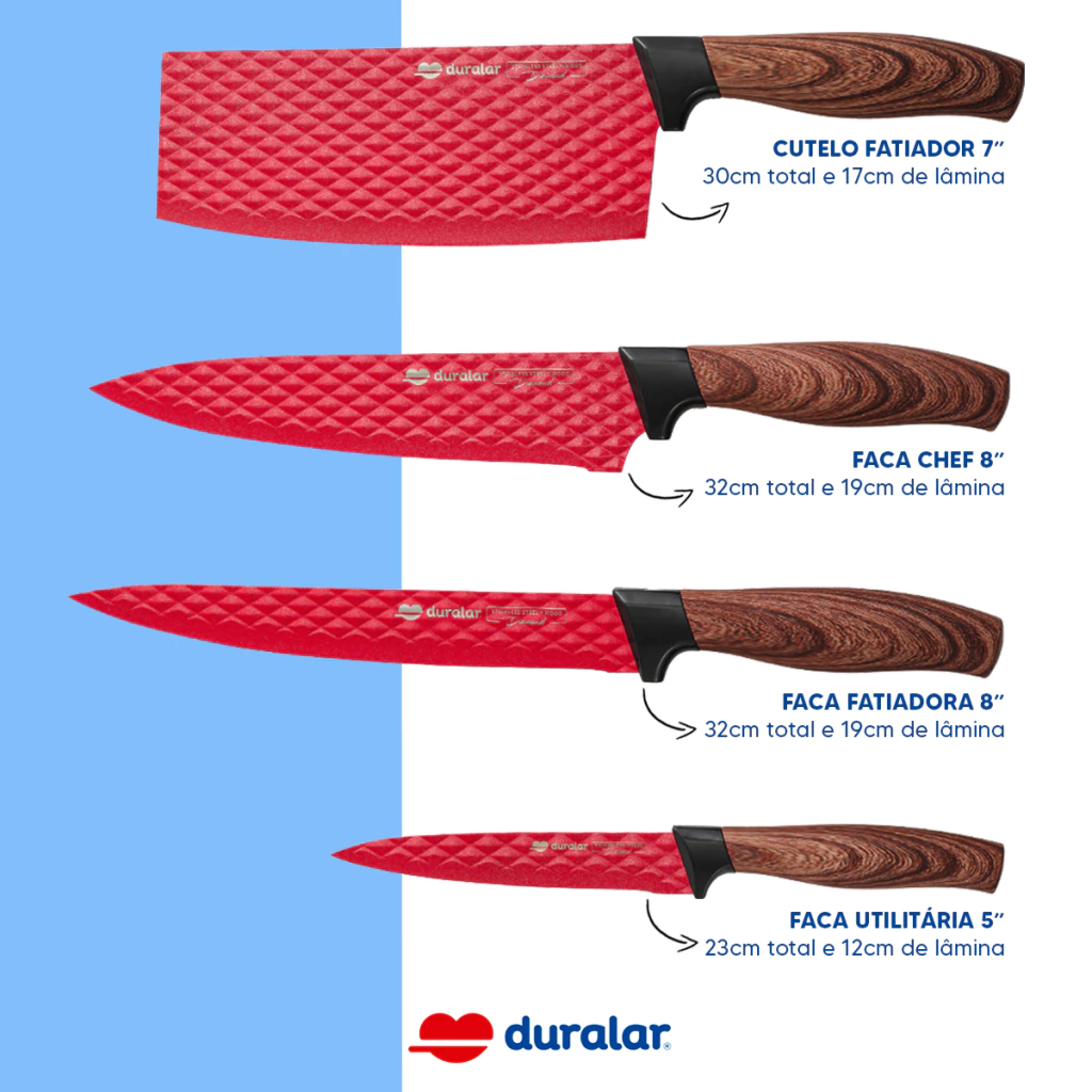 Com o Jogo de Facas Diamond da Duralar, suas preparações culinárias ganham um toque de sofisticação, praticidade e desempenho. Perfeito para transformar sua cozinha em um ambiente profissional!